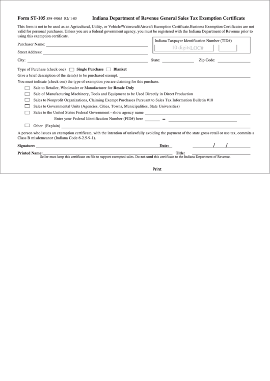 Fillable St 105 Form Indiana Department Of Revenue General Sales Tax Indiana State Tax Exempt Form