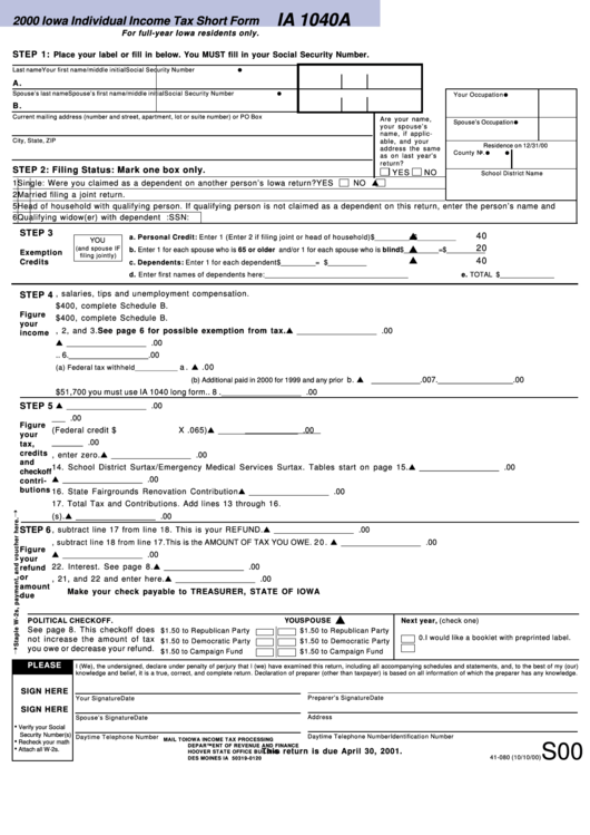 Form Ia 1040a Iowa Individual Income Tax Short Form 2000 Printable
