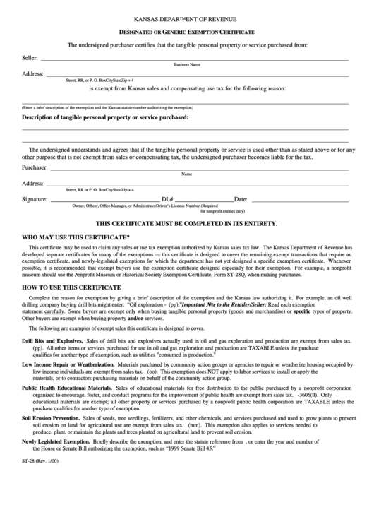 Form St 28 Designated Or Generic Exemption Certificate Kansas