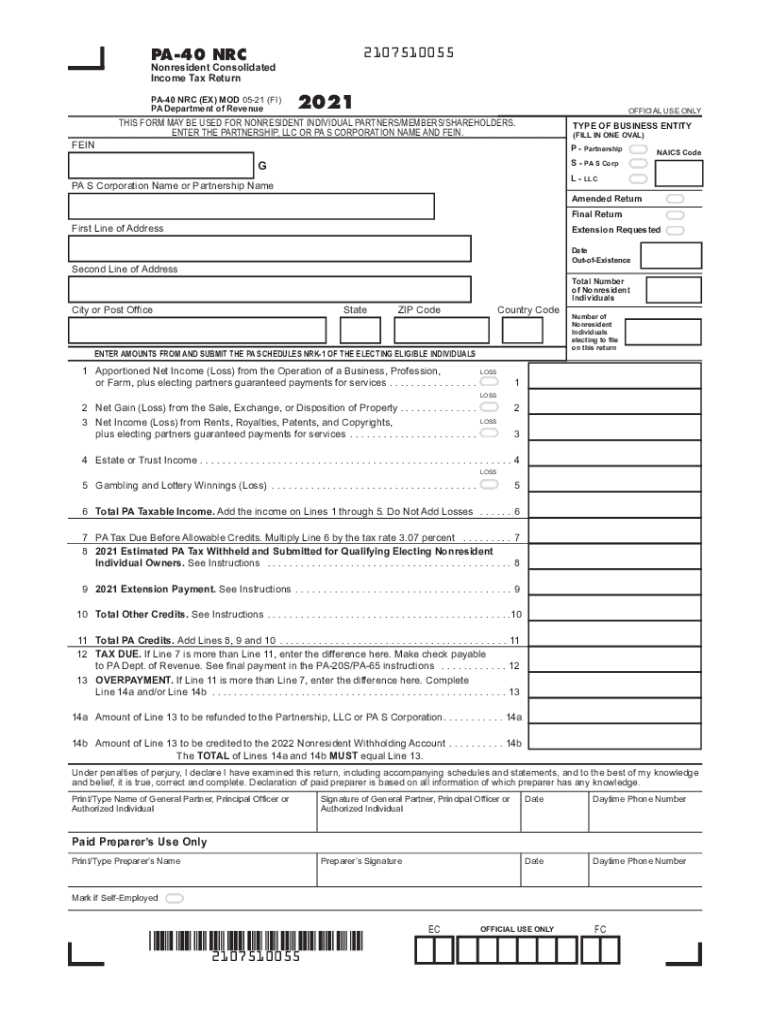 Fillable Online 2021 PA 40 NRC Nonresident Consolidated Income Tax