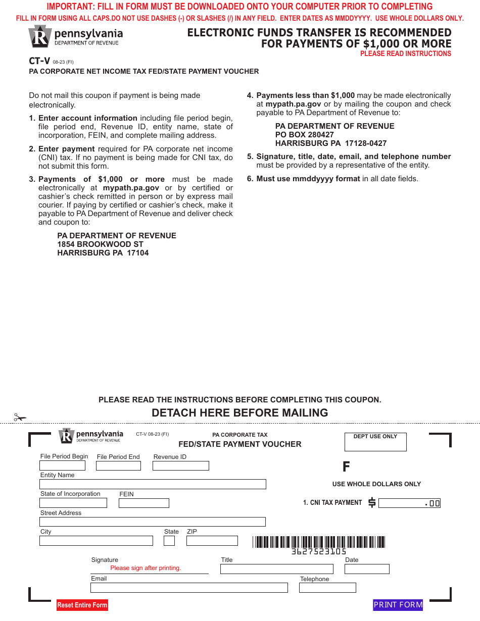 Form CT V Download Fillable PDF Or Fill Online Pa Corporate Net Income Tax Fed State Payment Voucher Pennsylvania Templateroller