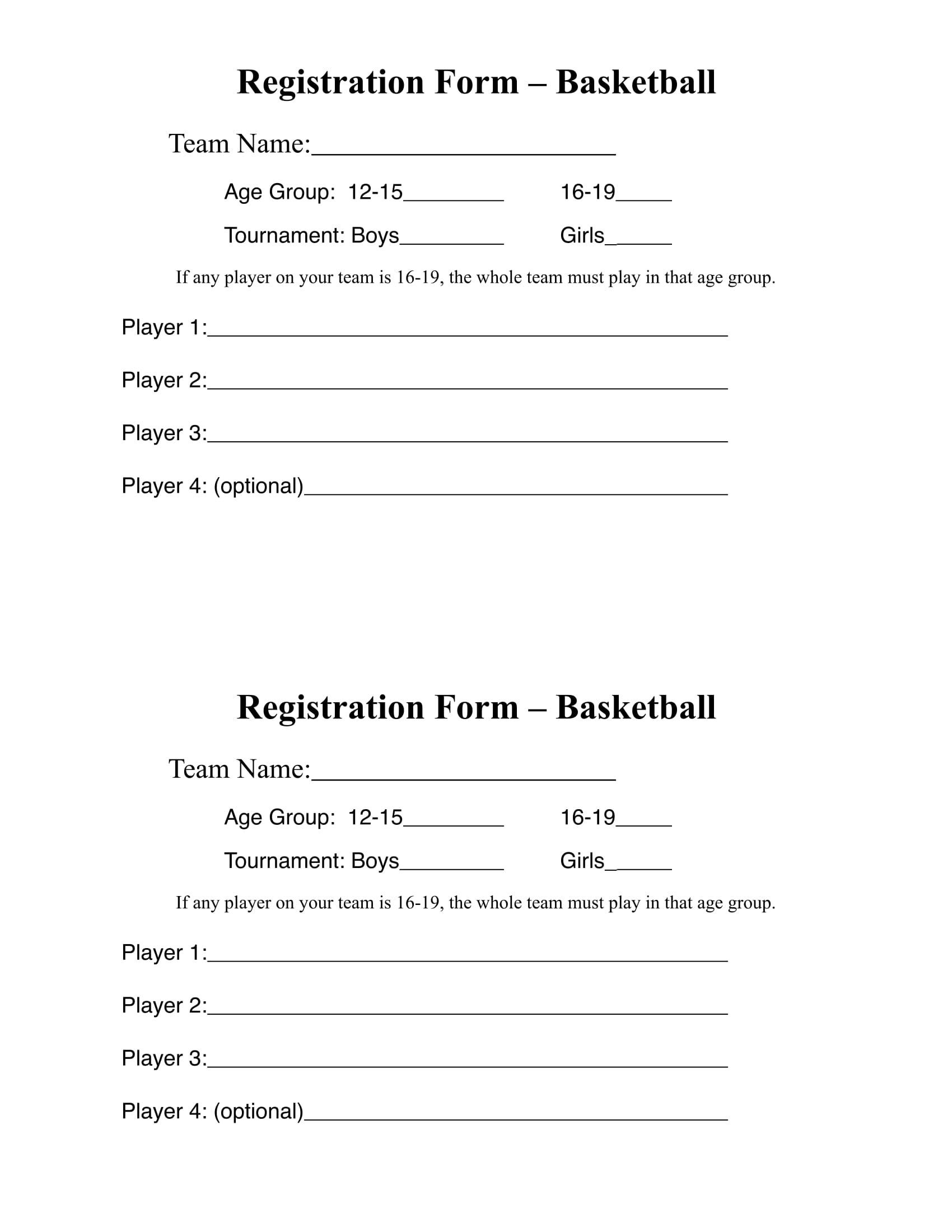 Printable Basketball Registration Form