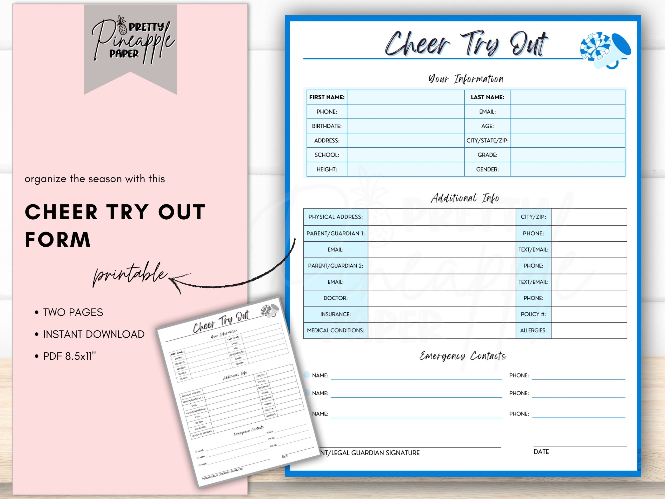 Printable Cheer Try Out Form Instant Download Template Cheerleader Try Out Registration Sports School Cheer Squad Team Coach Etsy