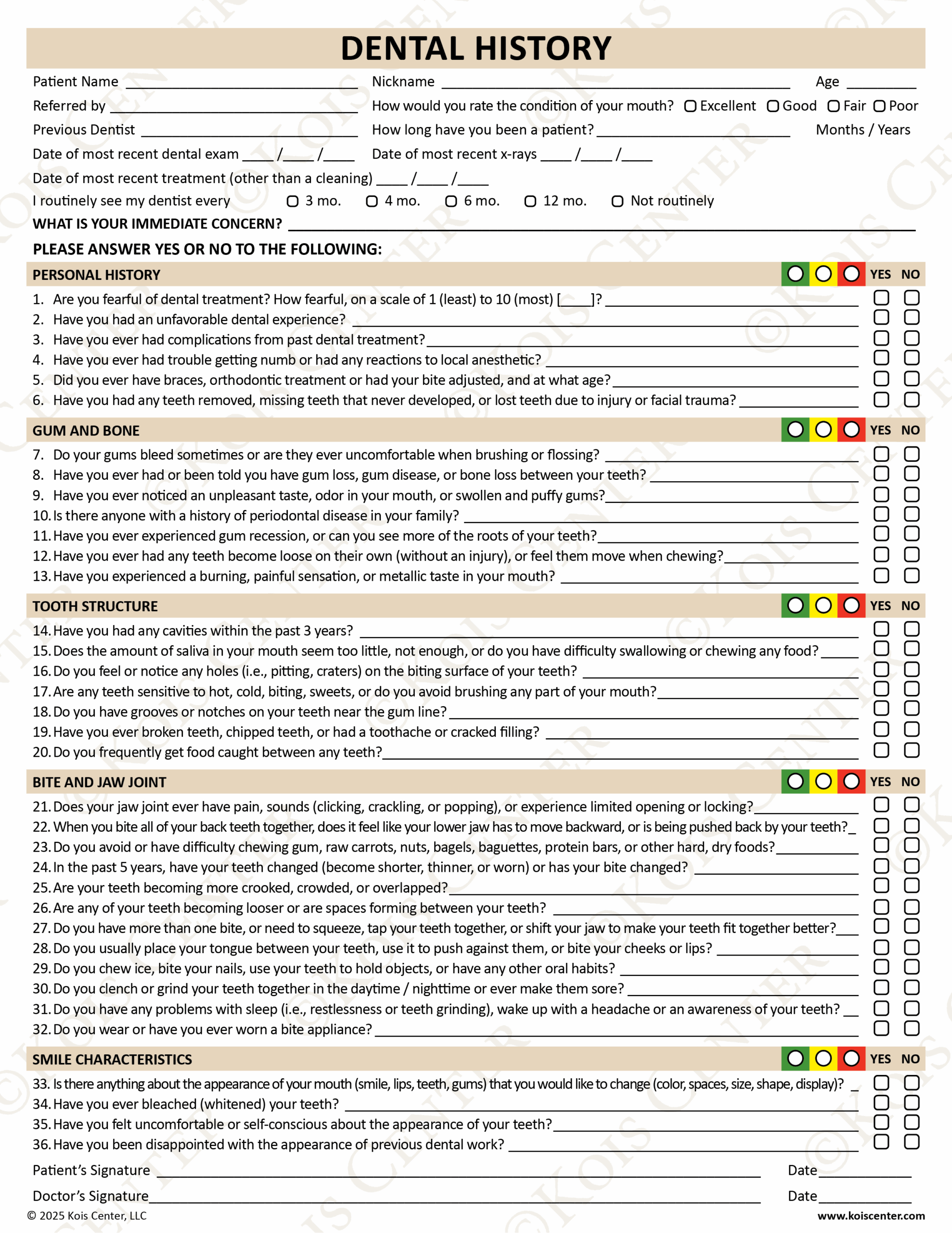 Printable Dental History Form