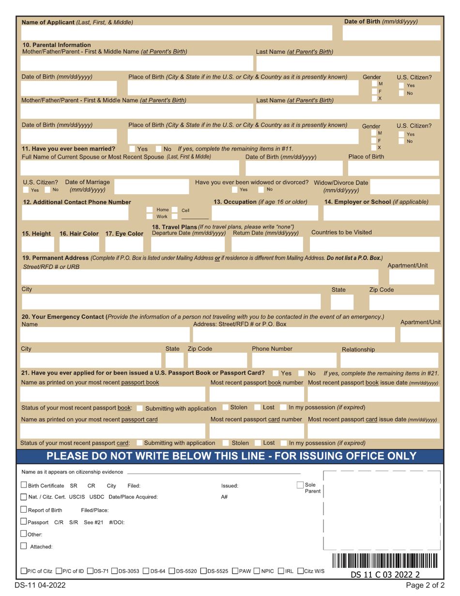 Printable DS-11 forms are readily available on the U.S. Department of State’s website. By downloading and printing the form, you can avoid the hassle of waiting in line at a passport agency or acceptance facility. This option is especially convenient for individuals who may not have easy access to a passport office or those who prefer to fill out the form in the comfort of their own home.