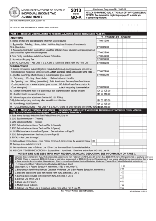Fillable Form Mo A Individual Income Tax Adjustments 2013 Printable