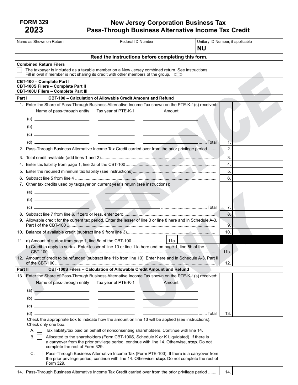 Form 329 Download Printable PDF Or Fill Online Pass Through Business Alternative Income Tax Credit 2023 New Jersey Templateroller
