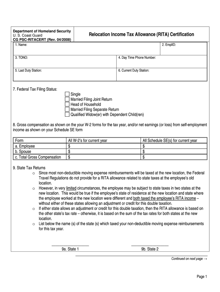 Fillable Online Uscg Relocation Income Tax Allowance RITA Certification Fillable Online Uscg Relocation Income Tax Allowance RITA Certification