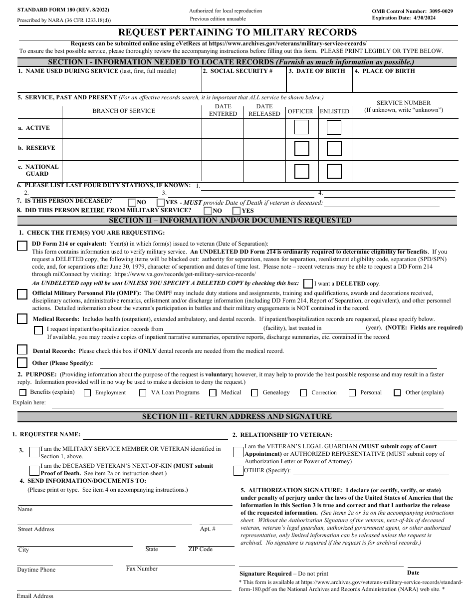 Download and Print Sf 180 Printable Form