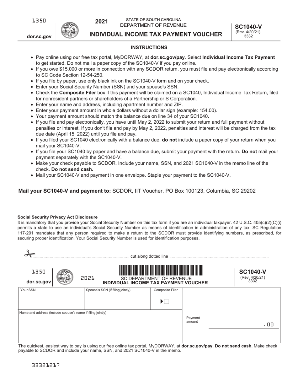 Form SC1040 V Download Printable PDF Or Fill Online Individual Income South Carolina State Income Tax Form