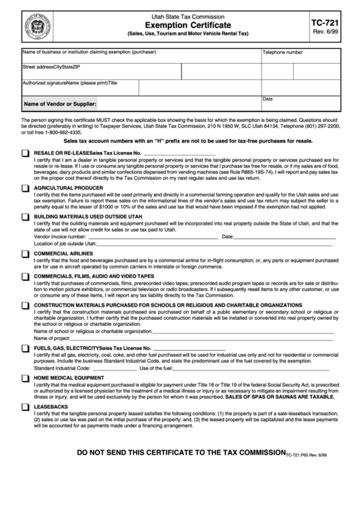 Tc 721 Form Utah State Tax Commission Exemption Certificate Printable Tc 721 Form Utah State Tax Commission Exemption Certificate Printable