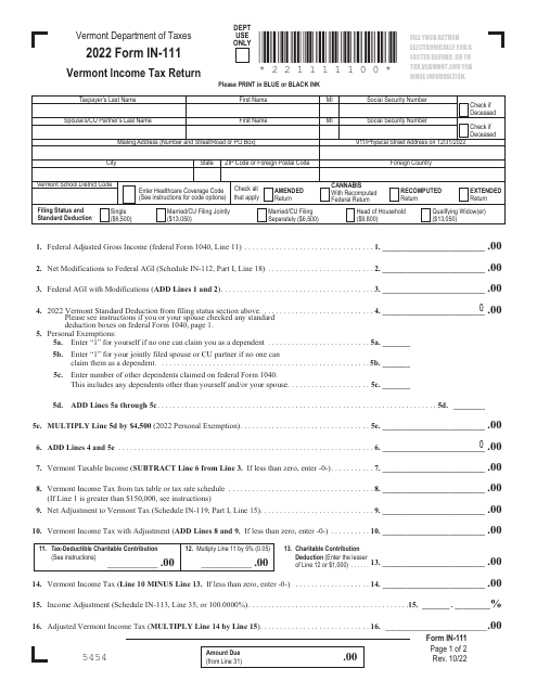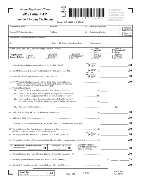 Form IN 111 Download Fillable PDF Or Fill Online Vermont Income Tax