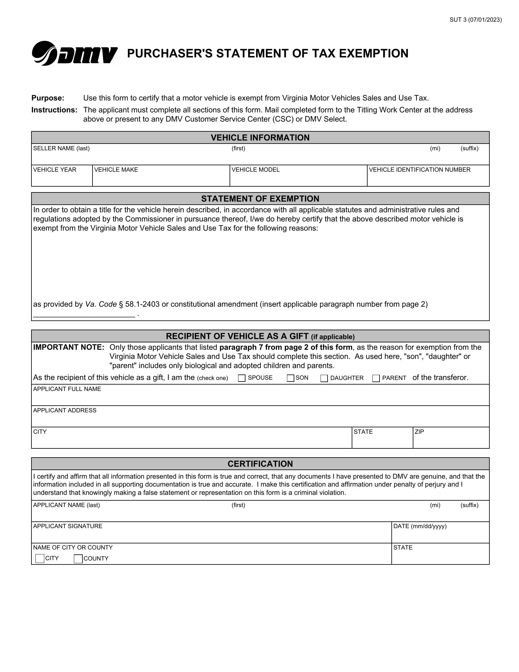 Form SUT 3 Purchaser 39 S Statement Of Tax Exemption Virginia Forms